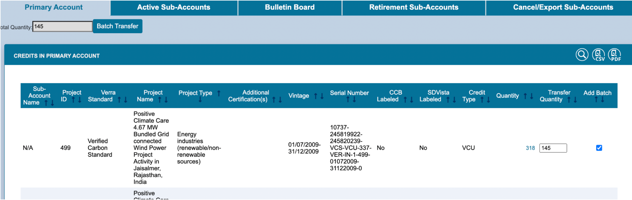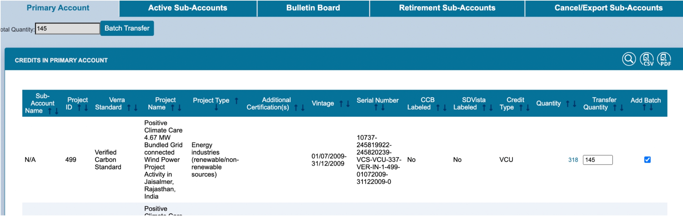 Go into the account where you are holding the credits to be retired In “Transfer Quantity” on the right, input the number of credits to be retired, and check the box for “Add Batch.” DO NOT select credits from different projects, or from the same project but different vintages.