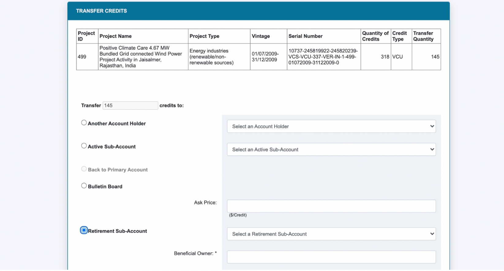 With these details you're ready to retire the batch of offsets on Verra ->.